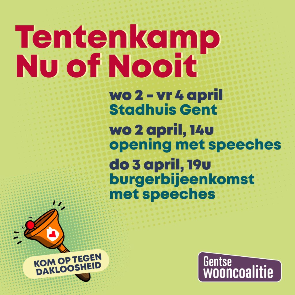KRAS zette samen met de Gentse wooncoalitie een tentenkamp op aan het stadhuis, om zo het stadsbestuur aan te sporen om niet te besparen op acties tegen dakloosheid, en voor betaal- en leefbaar wonen. Dit gebeurde doorlopend van woensdag 2 april om 14u tot vrijdag 4 april om 9u.